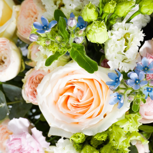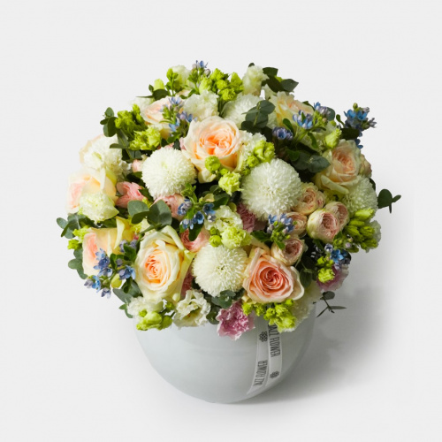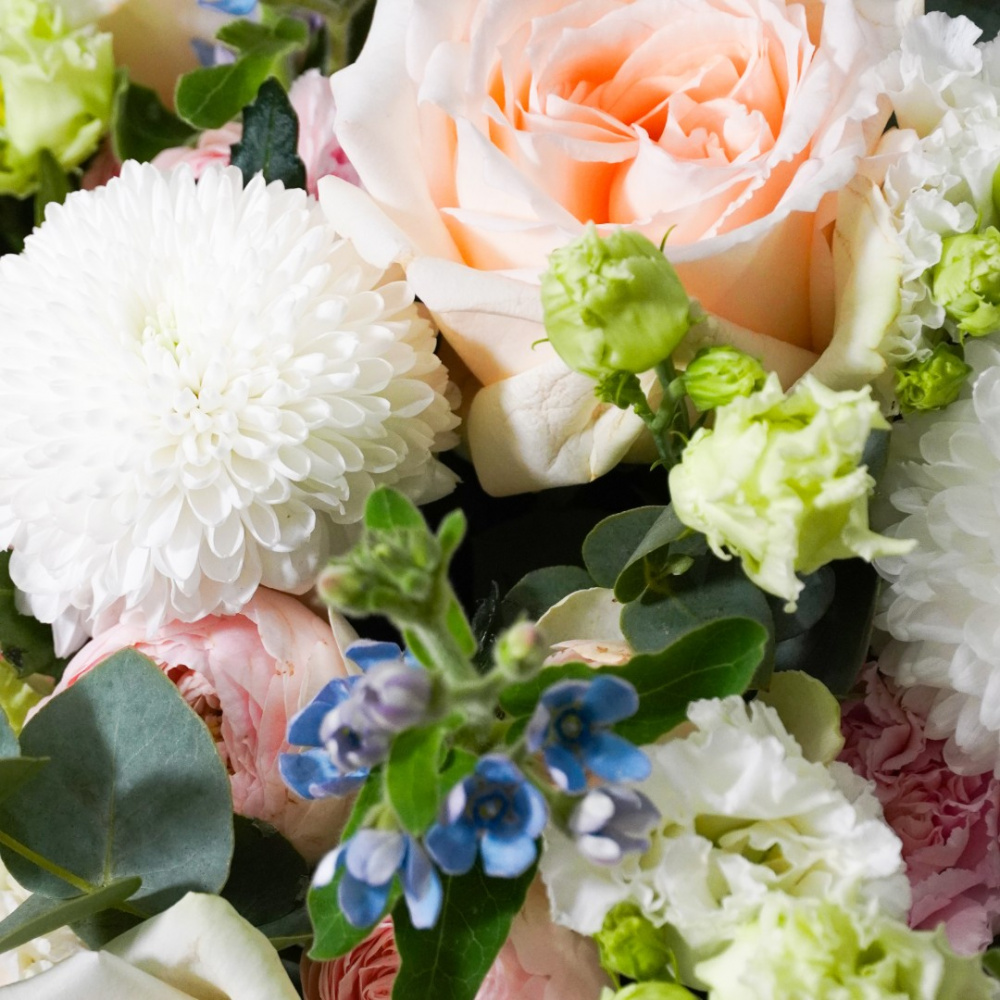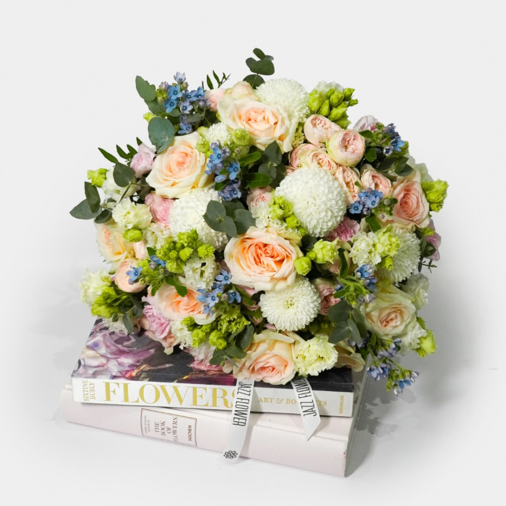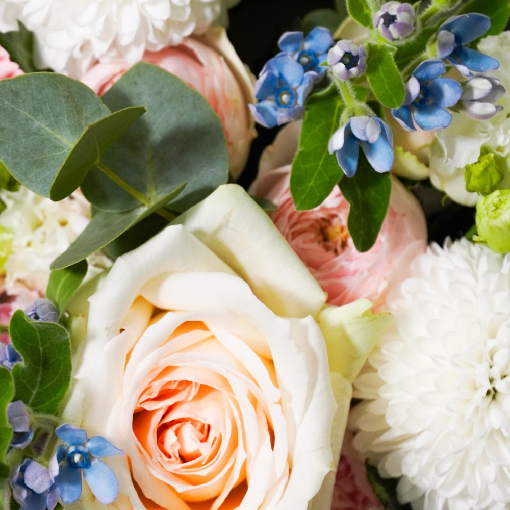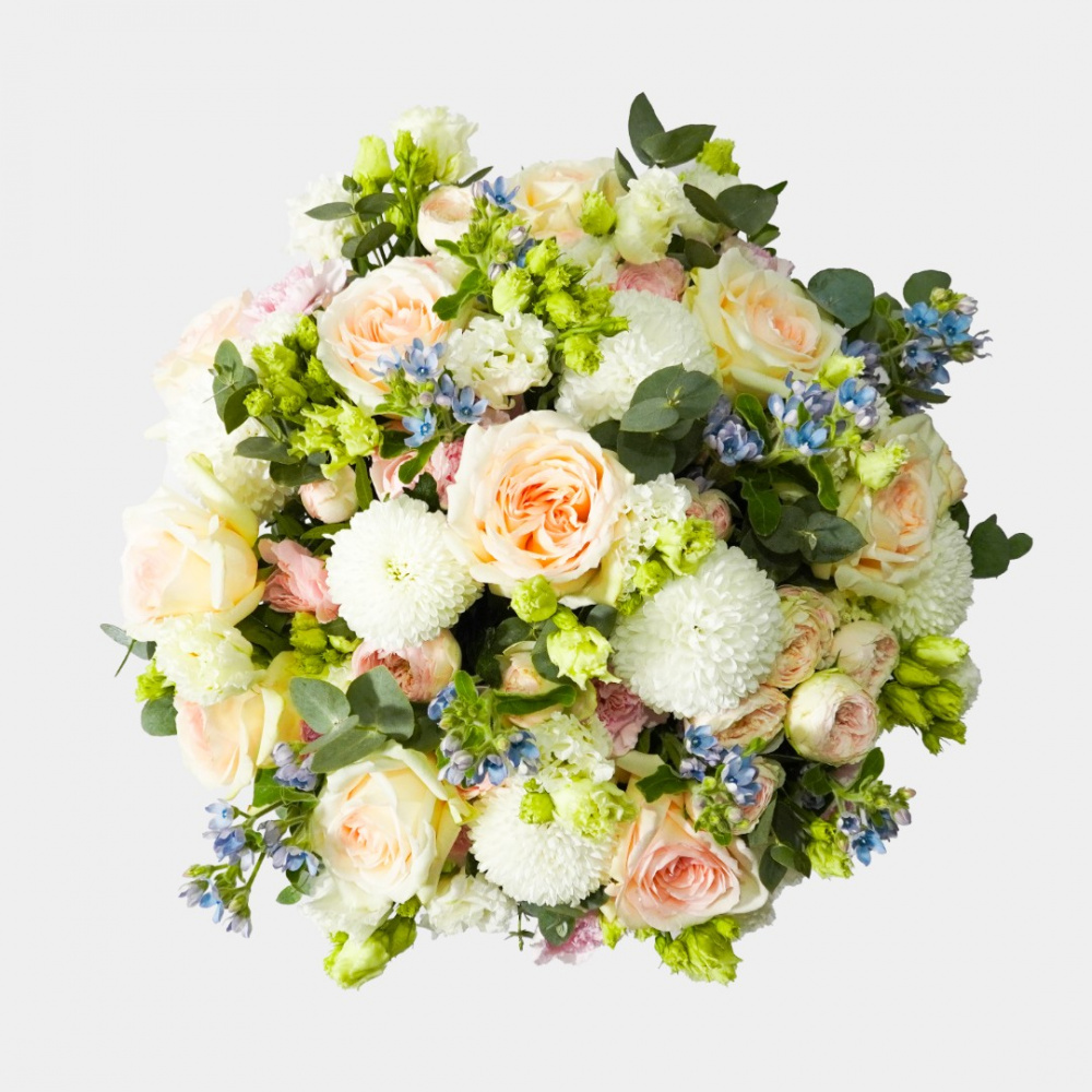 Букет из французских и кустовых роз, оксипеталума, эустомы хризантемы и гвоздики с эвкалиптом