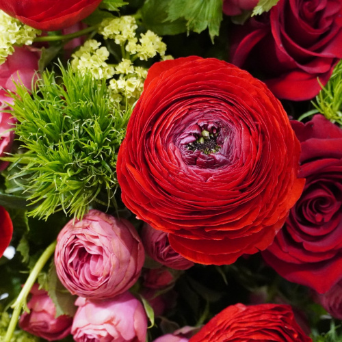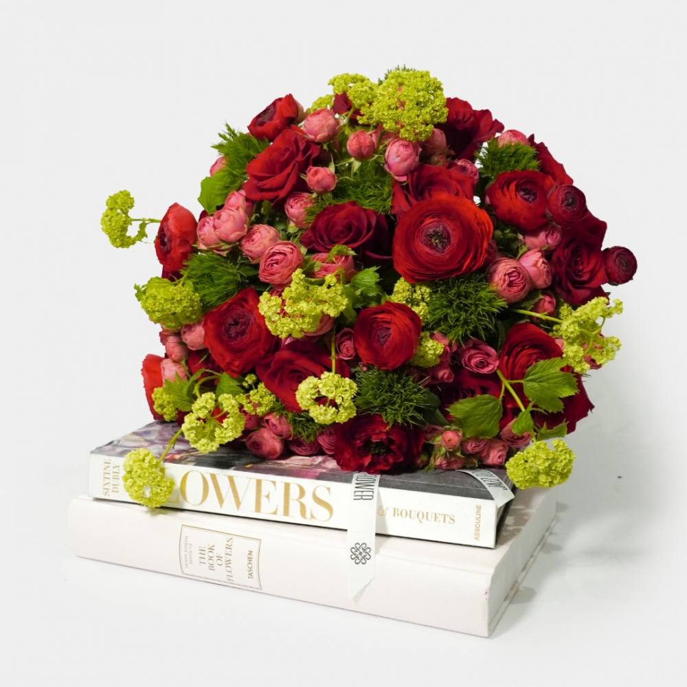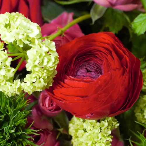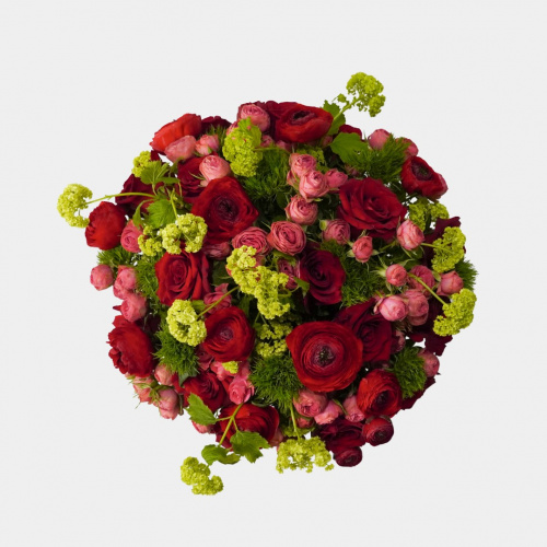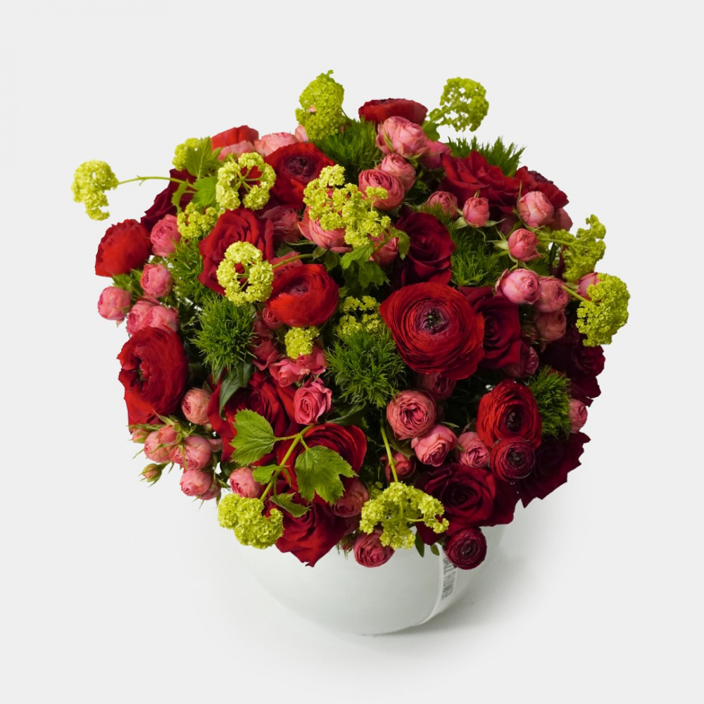 Букет из кустовых и эквадорских роз, ранункулюса, вибурнума и гвоздик