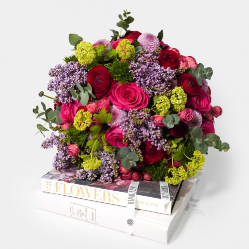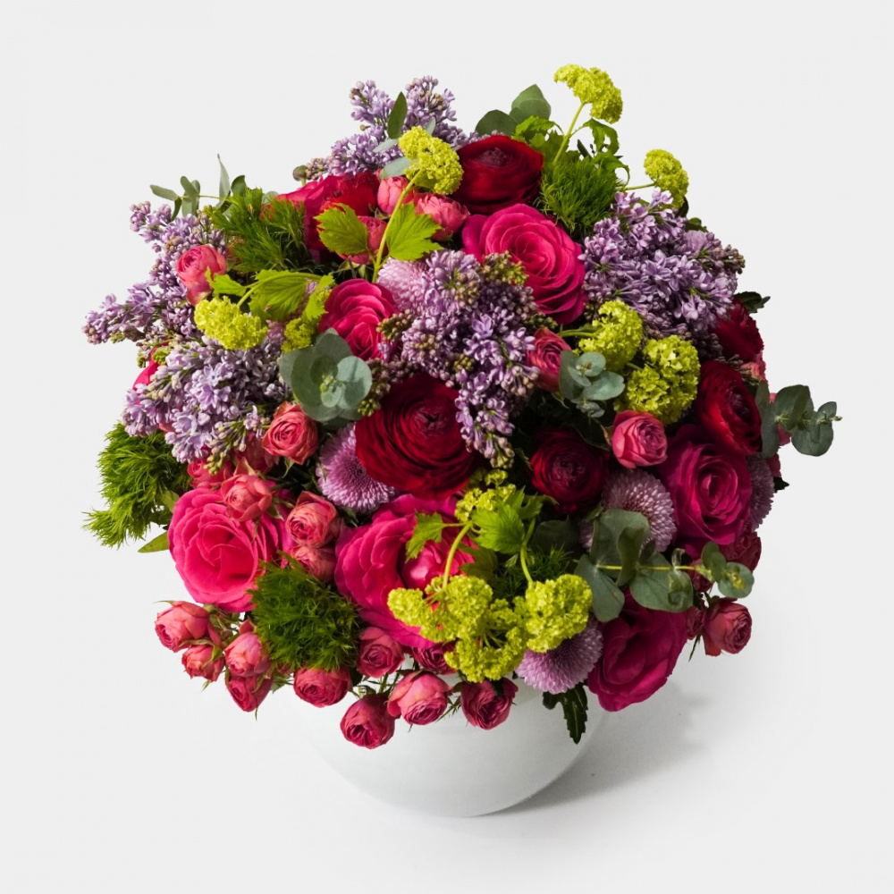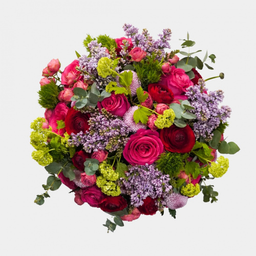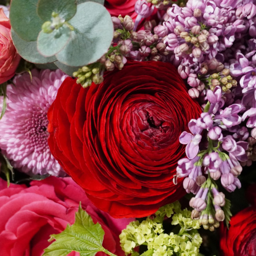 Букет из сирени, кустовых и эквадорских роз, ранункулюса, хризантем, вибурнума и гвоздик