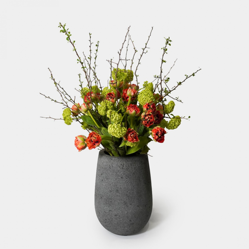 Букет из французских тюльпанов, вибурнума и веток спиреи