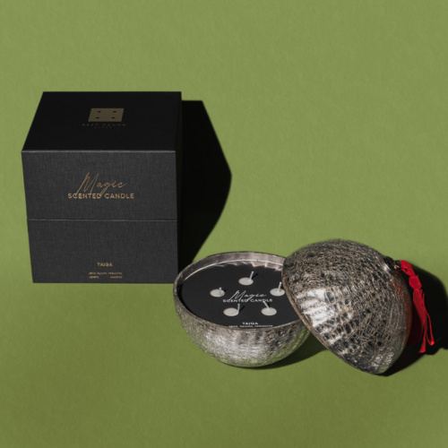 В комплект входят: бархатный бант (техника «галстучного узла»), брендированные каминные спички и подарочная коробка с золотым тиснением.