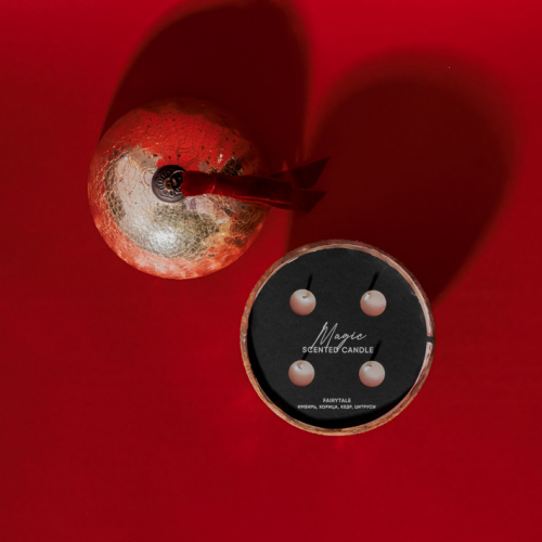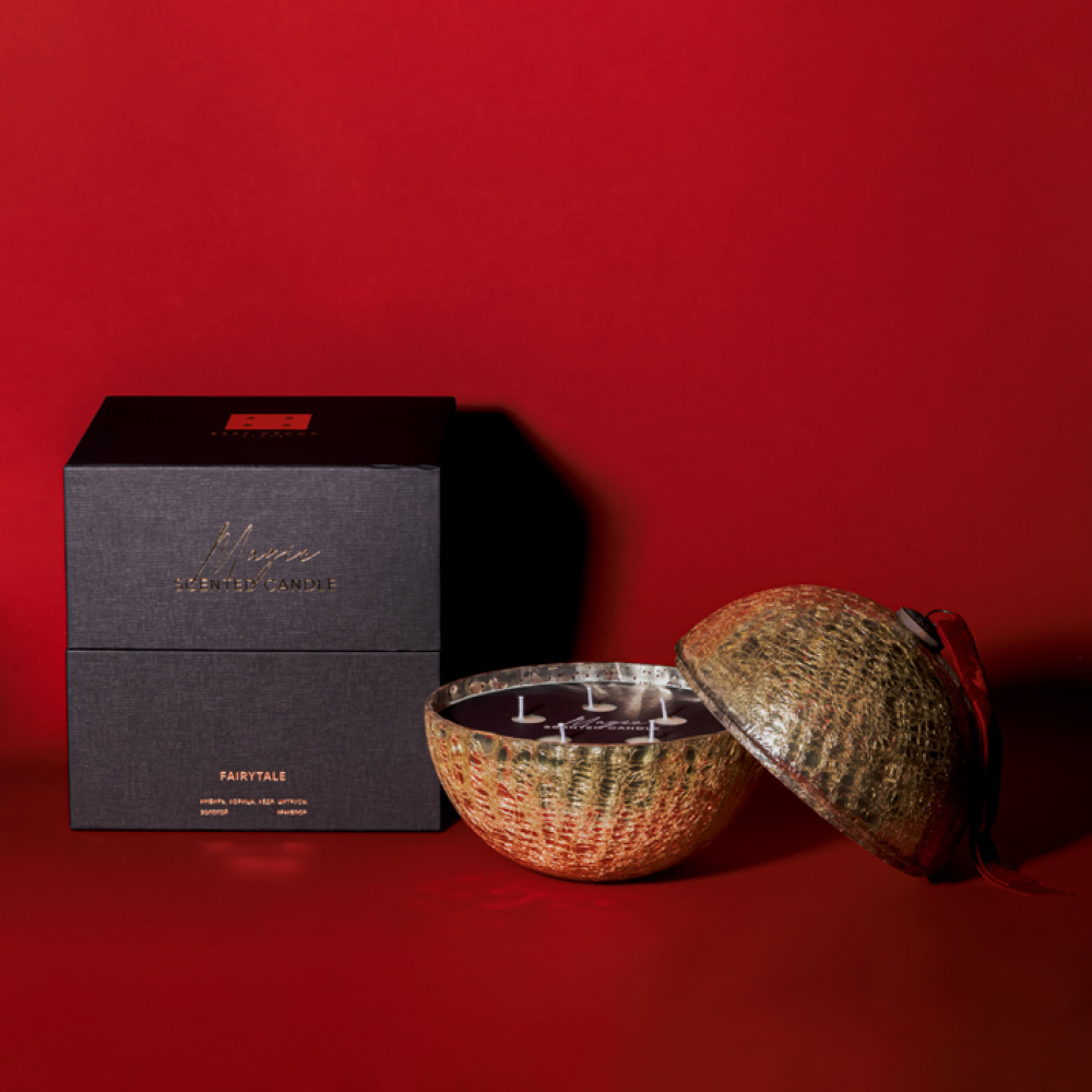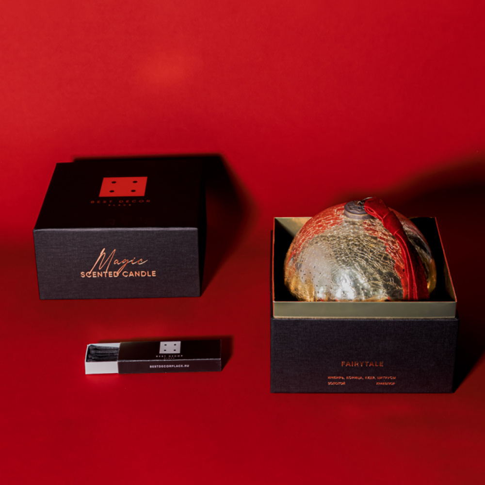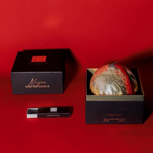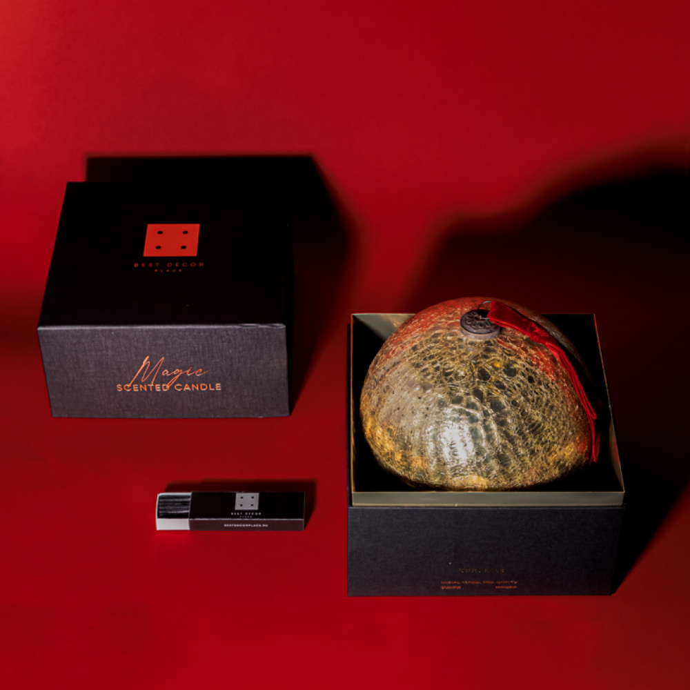 В комплект входят: бархатный бант (техника «галстучного узла») и брендированные каминные спички. Эстетичная коробка с фактурной поверхностью и золотым тиснением позволяет вручать свечу сразу как подарок.
