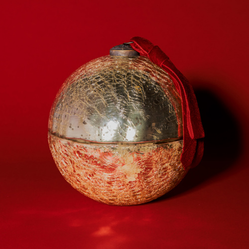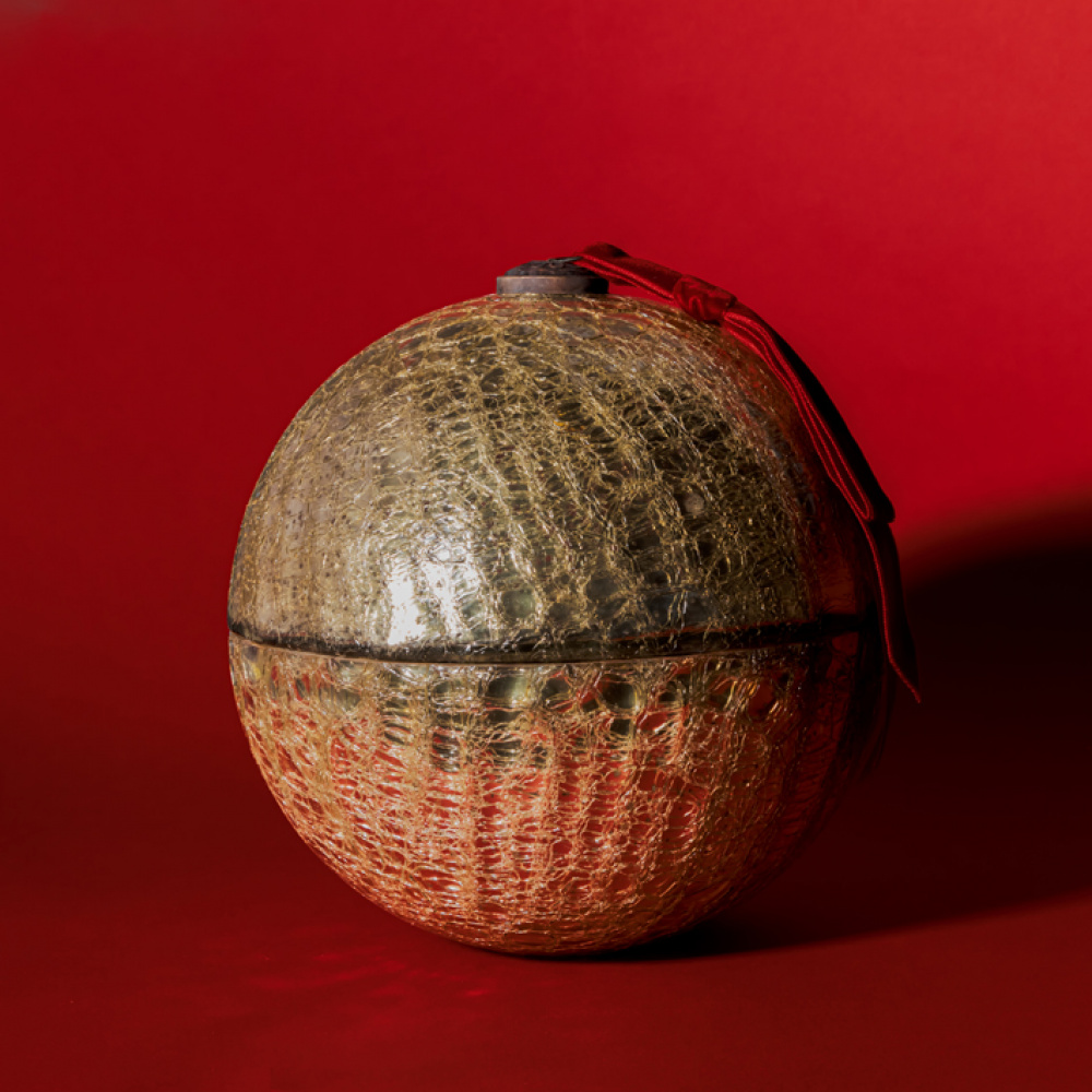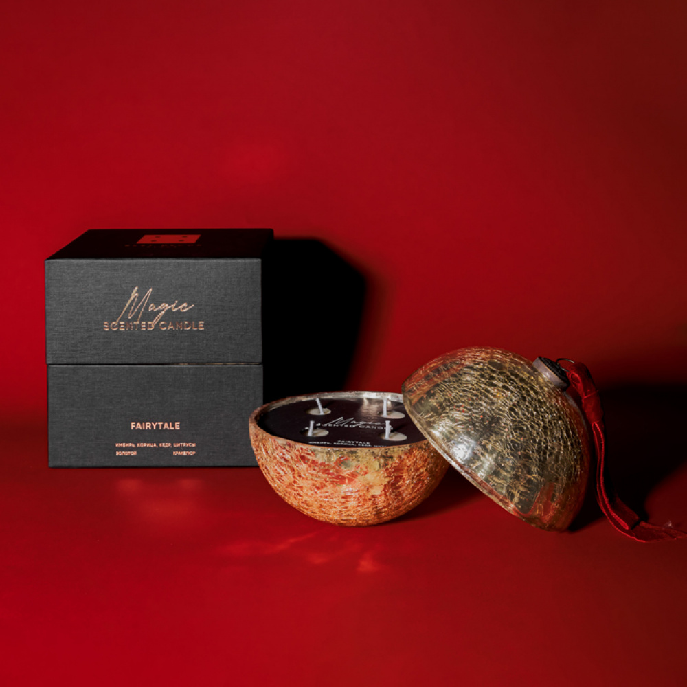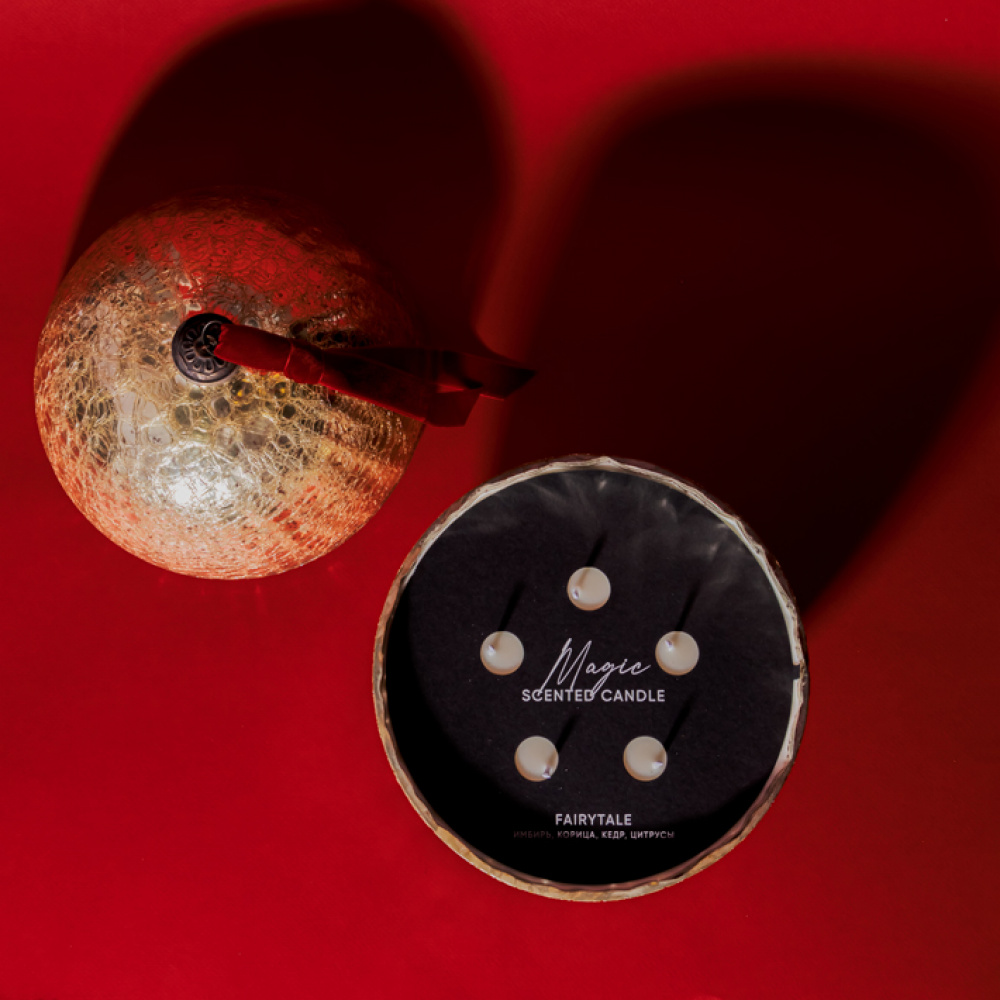 Новогодняя свеча в форме шара: кракелюрная фактура и золотое внутреннее напыление делают её выразительным элементом праздничного оформления и готовым подарком.