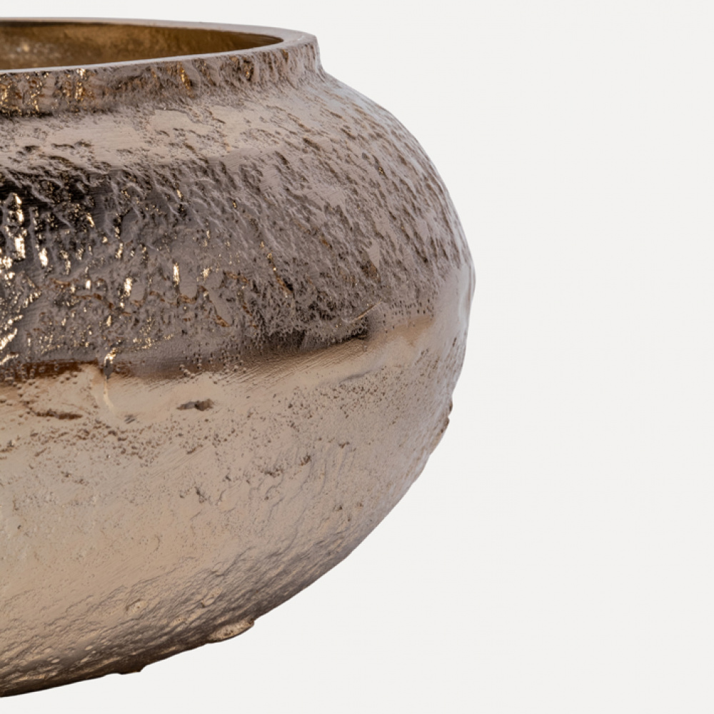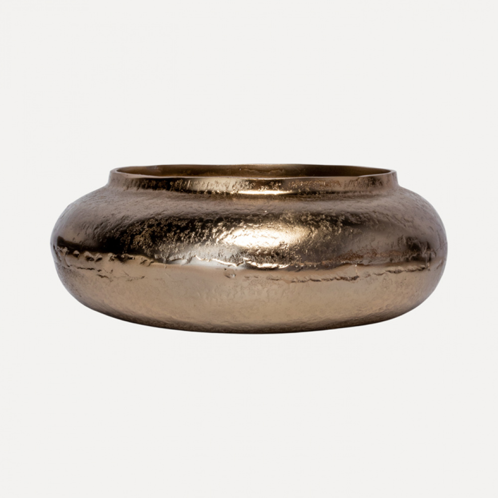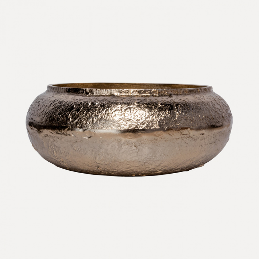 Круглая металлическая ваза‑чаша из бронзы с грубой обработкой поверхности — выразительный декоративный элемент для оформления интерьеров и экстерьеров.